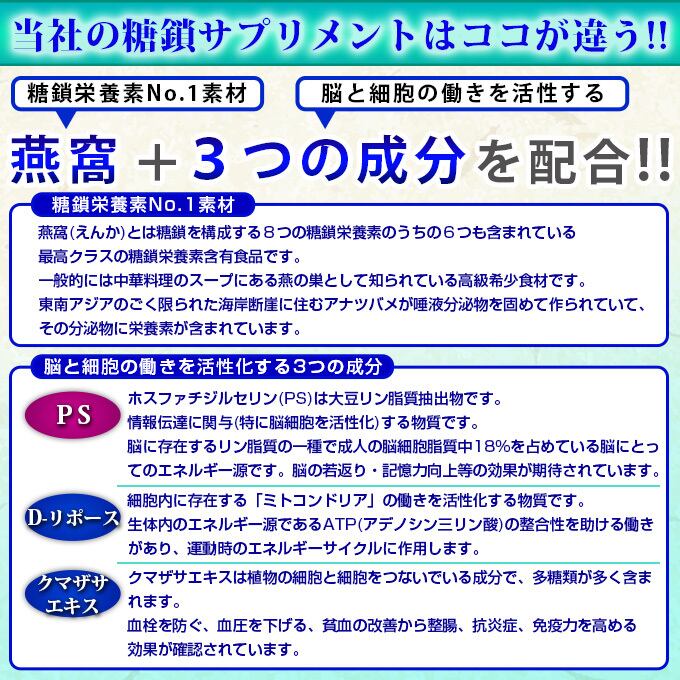 糖鎖栄養素No1素材の燕窩(えんか)と脳と細胞の働きを活性する3つの成分PS、D-リポース、クマザサエキスを配合しています。